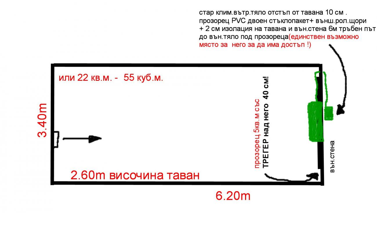 Здравейте от ново вчера малко ви заблудих понеже пишех от таблета и бях на работа за това да започнем от ново с точните размери ,снимки и въпроси.Предстой до месец закупуване на нов климатик бюджет 2500лв(дигнах го малко за да има обективност) прилагам снимка с подробно описание на стая и размери ,но имам един два въпроса първо ето снимката: