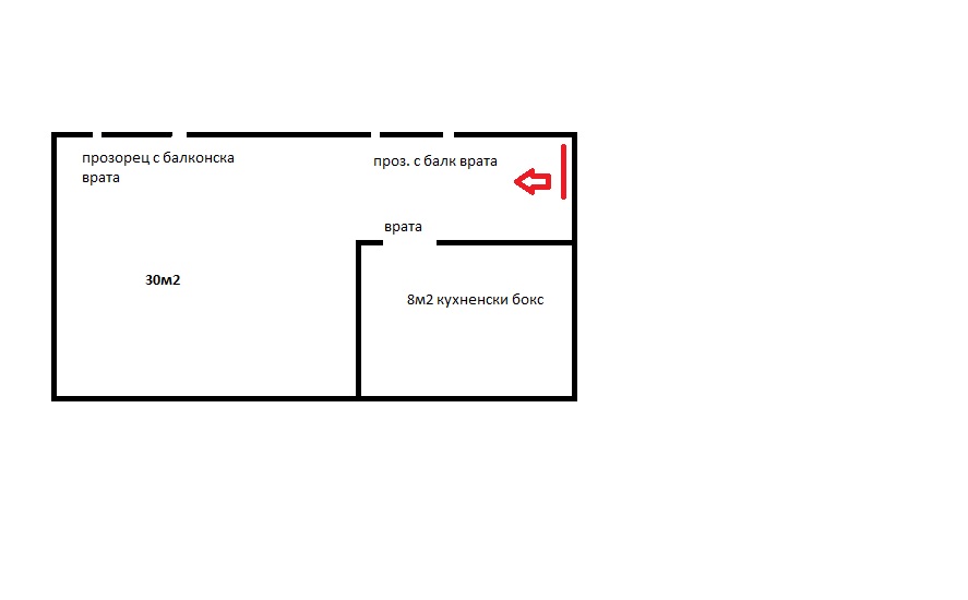 1. Стая 45 кв.м., в блок тухла, ет. 5, южно изложение, сменена дограма Кьомерлинг стъклопакет енерджи 6-4, на практика само южната стена (там се намира терасата) е външна.