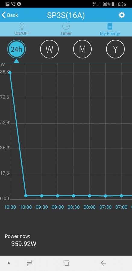 В 10:00 е пуснат на охлаждане, задание 24°. Въпреки, че има над 3,5° разлика между задание и стайна се закротва на 350W и не си дава зор да наваксва нещо. Това е така защото при стартиране външната бе 26°.