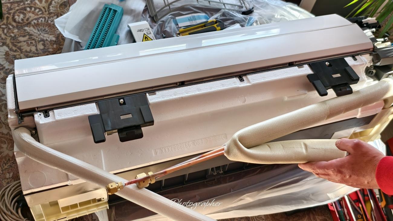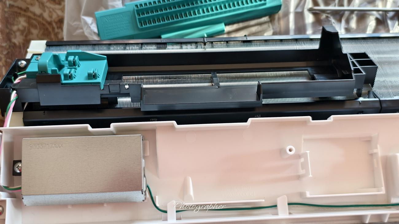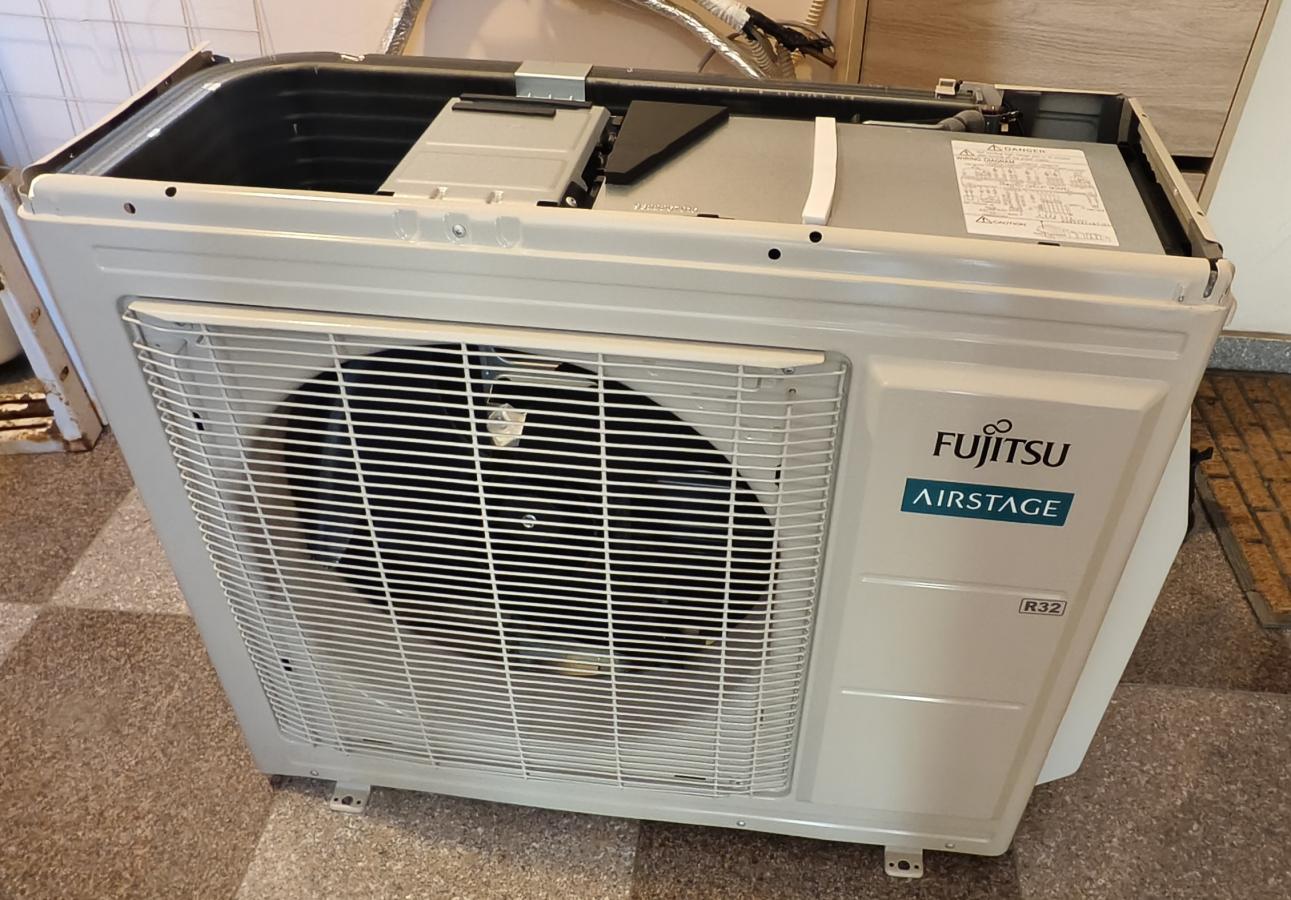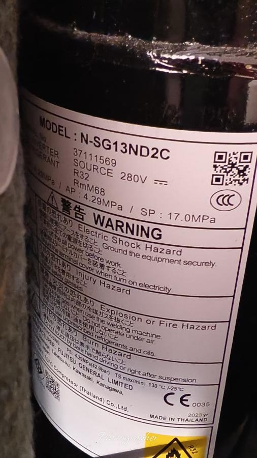 Ще започна с това, че модела е предвиден за северен климат, тоест за скандинавските страни... Наистина сериозен хардуер, който в последно време все по-рядко се среща в климатичната техника. Външното тяло е голямо (42 kg.) с двоен топлообменник и 1320 gr. хладилен агент. По-тежко е от 18-ка на същата марка в средния клас (визирам 18KMTE). Като физически размери са еднакви. Модела е с нагревател на дъното (много добре изпълнен, не като масовите китайци с една жица, тоест набедените нордици), двойнороторен компресор (в сервизното ръководство е даден че е еднороторен) TCFG N-SG13ND2C (925W) производство на Fujitsu в Тайланд (вижда се от снимките). да си призная, не знаех, че марката произвеждат вече компресори. Модела е снабден и с пресостат за високо налагане.