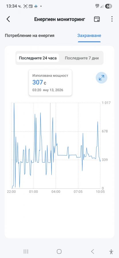 Графика на Midea 09 BreezeleSS от снощи за 12 часа работа когато външната температура падна до минус седем градуса климатика работи при зададени 30 процента турбина и 22 градуса, В 04.00 часа вдигнах заданието на 24 градуса че съм настинал и ми е студено.За 12 часа работа Мидеята направи само един дефрост,когато Мидеята работи на тих режим пада и под 300 вата.