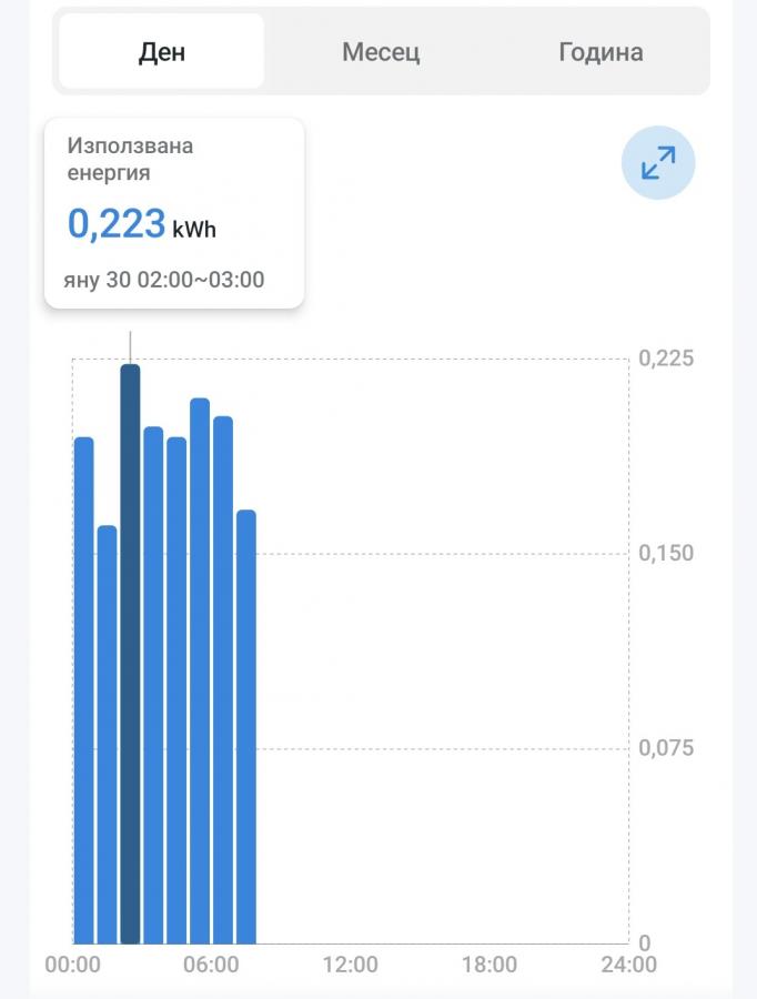 Добро утро на всички. Погледнах сега да видя графиката от снощи. Плътно 370 вата, като не се изключил нито веднъж. На две места има колебания до 440 вата и после пак си слиза на 370. Може би толкова си му трябват. Нагласен на 23 със тих режим. В стаята постоянни 26 градуса. Ще пробвам още веднъж да променя настройките, Първия път климатика го държах 1 минута изключен от контакта и всичко се получи както е на клипа. Ще видим.