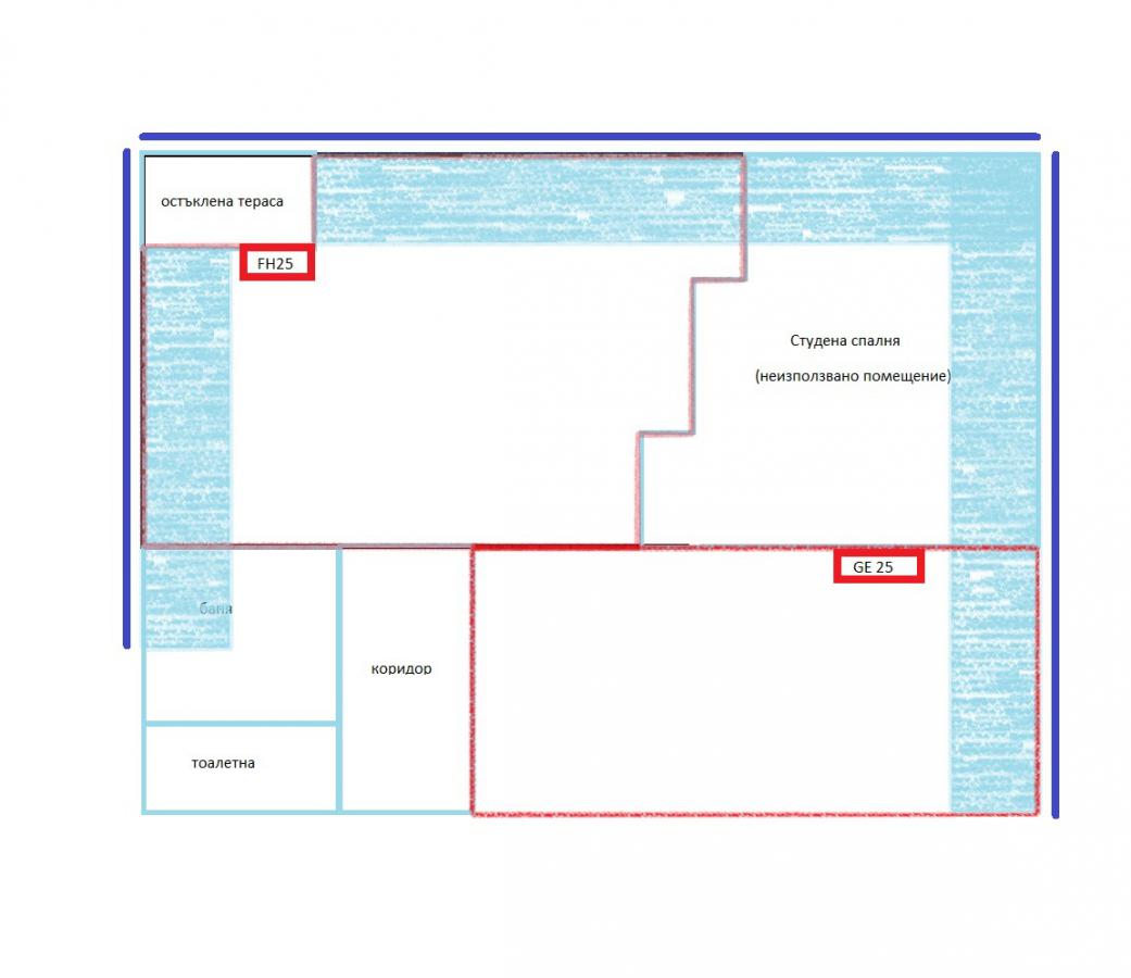 Топлозагубите идват от това че помещението е северно ориентирано и е на първи етаж. Освен цялата северна стена която е по-дъгата (приблизително 6м) също и цялата и западната стена е външна (4м). Освен това източната къса стрена е към спалня която за момента не ползвам и не отоплявам, също и част от южната стена контактува с баня която също не е топла тъй като пък една от нейните стени е външна(макар и изолирана). Така че общо взето две напълно външни стени които слънце зимно време никога не огрява (западната понеже е в сянка от друга част от блока), плюс условно казано две почти полувъншни стени :) Като прибавя и факта че от северната и западната страна пода надстърча с близо метър от основата на блока и не само че няма кой да ме топли отдолу ами напрактика вися във въздуха, мисля че е илюзия да не очаквам интензивно топлоотдаване, дори при добра изолация.