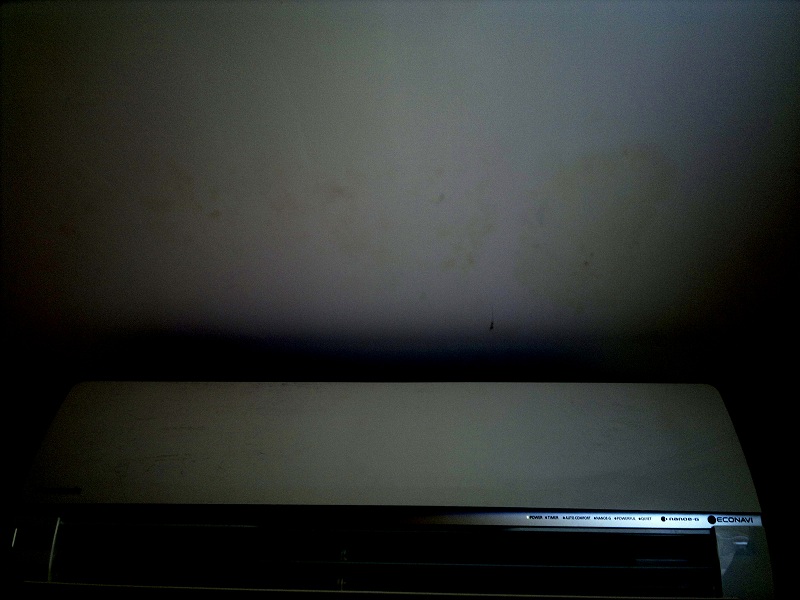 Петната не са над него, а пред него на тавана снимката е направена ~45% спрямо климатика. Стаята е след ремонт никога не е имало проблеми. Дори и да има влага отгоре тя ще се разпространи от страничната стена към петното, а то е само там 40-50см от двете стени.