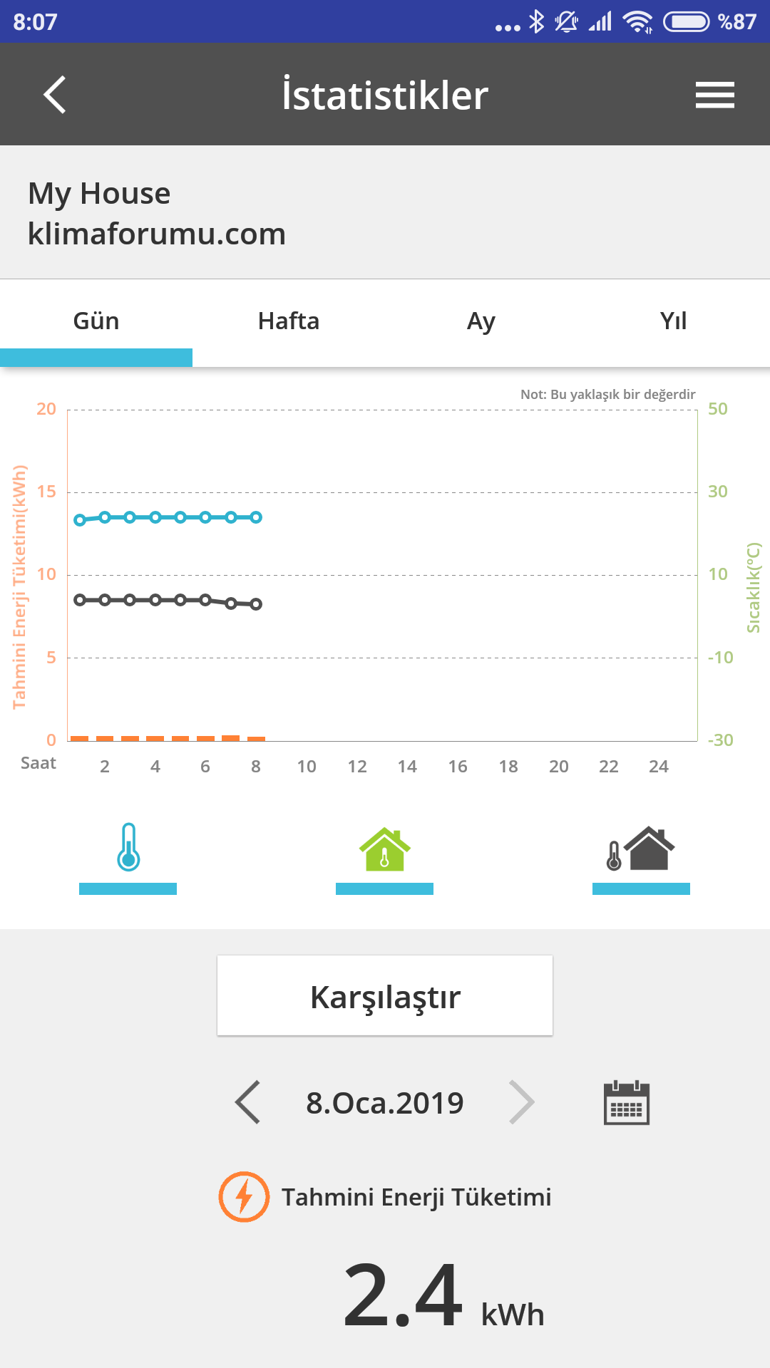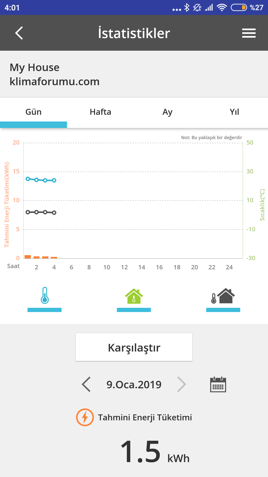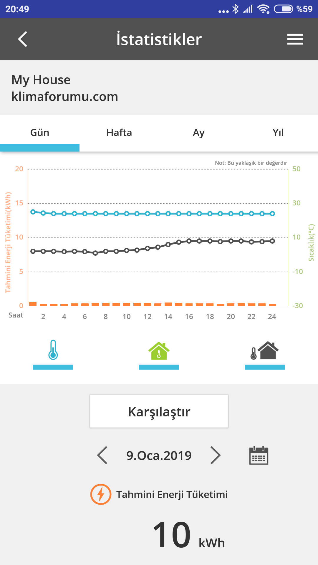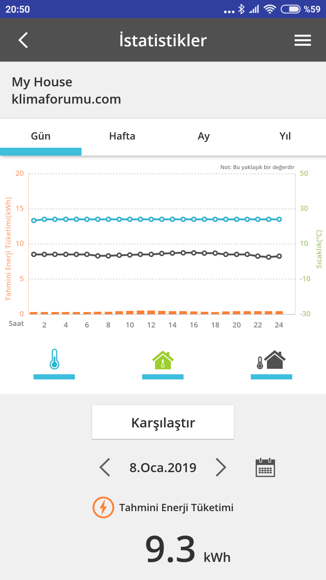 Консумация от 20:00 снощи до сега 6.3 киловатчаса, средно по 293 на час. Имаше и слъне през деня, то също е помагало, но ето това вече бих го нарекъл нормален режим на работа и нормална консумация. Макар че, да не издребнявам съвсем, но все ми се струва, че може и още надолу, предвид условията.