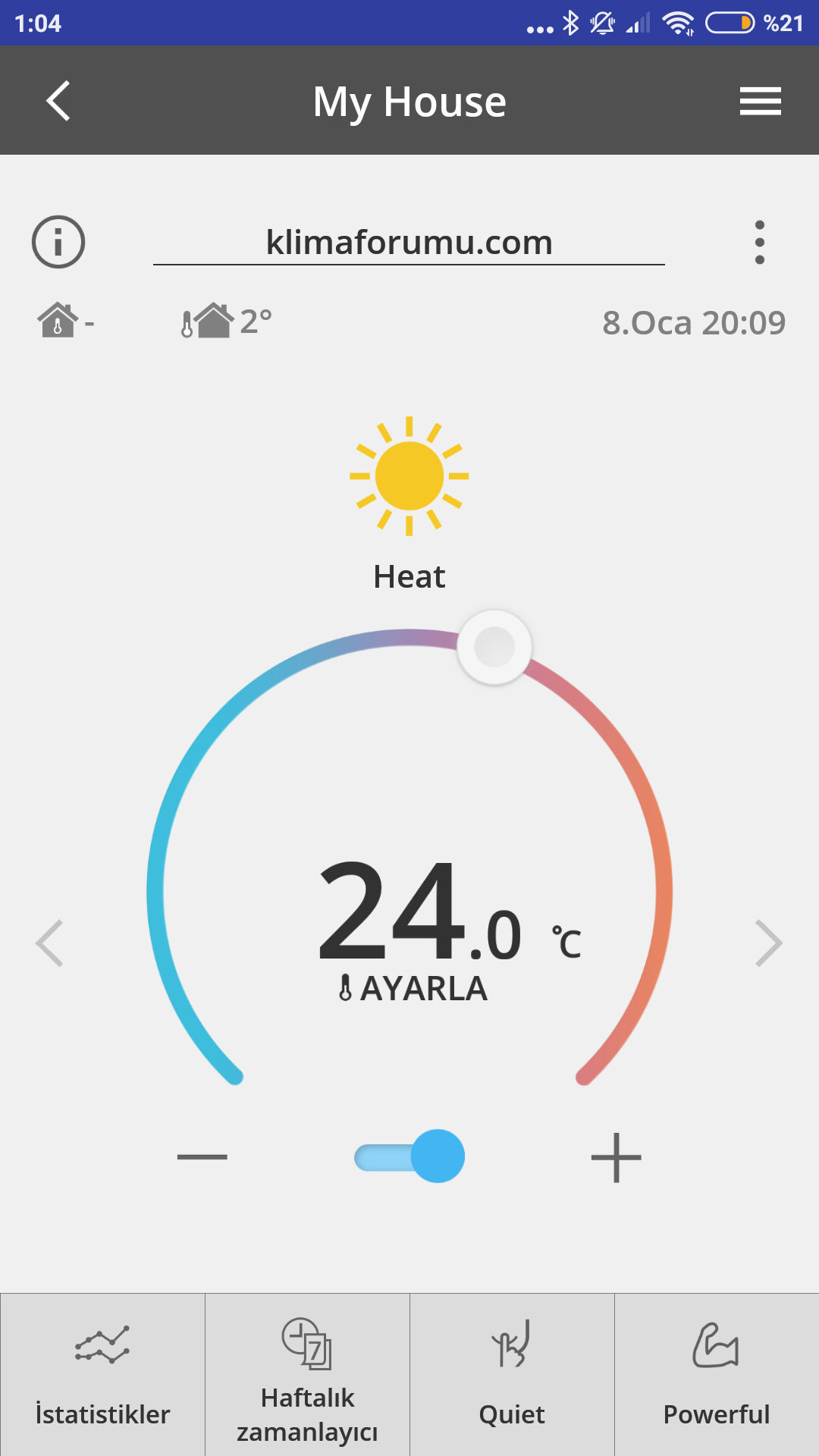 Пред деня не бях у дома. Сега се прибрах, погледнах го. Работеше на 340 вата, зададени 21. Точно 2 минути, докато се преоблека, чух как турбината рязко намали скоростта. Погледнах електромерчето, което показваше 7 вата. Погледнах и външното тяло - никакъв шум от него, перката също не се въртеше. Навън е около 1-2 градуса. Помислих, че прави дефрост. Погледнах лампата, но не мигаше като за дефрост, ами си свети нормално.