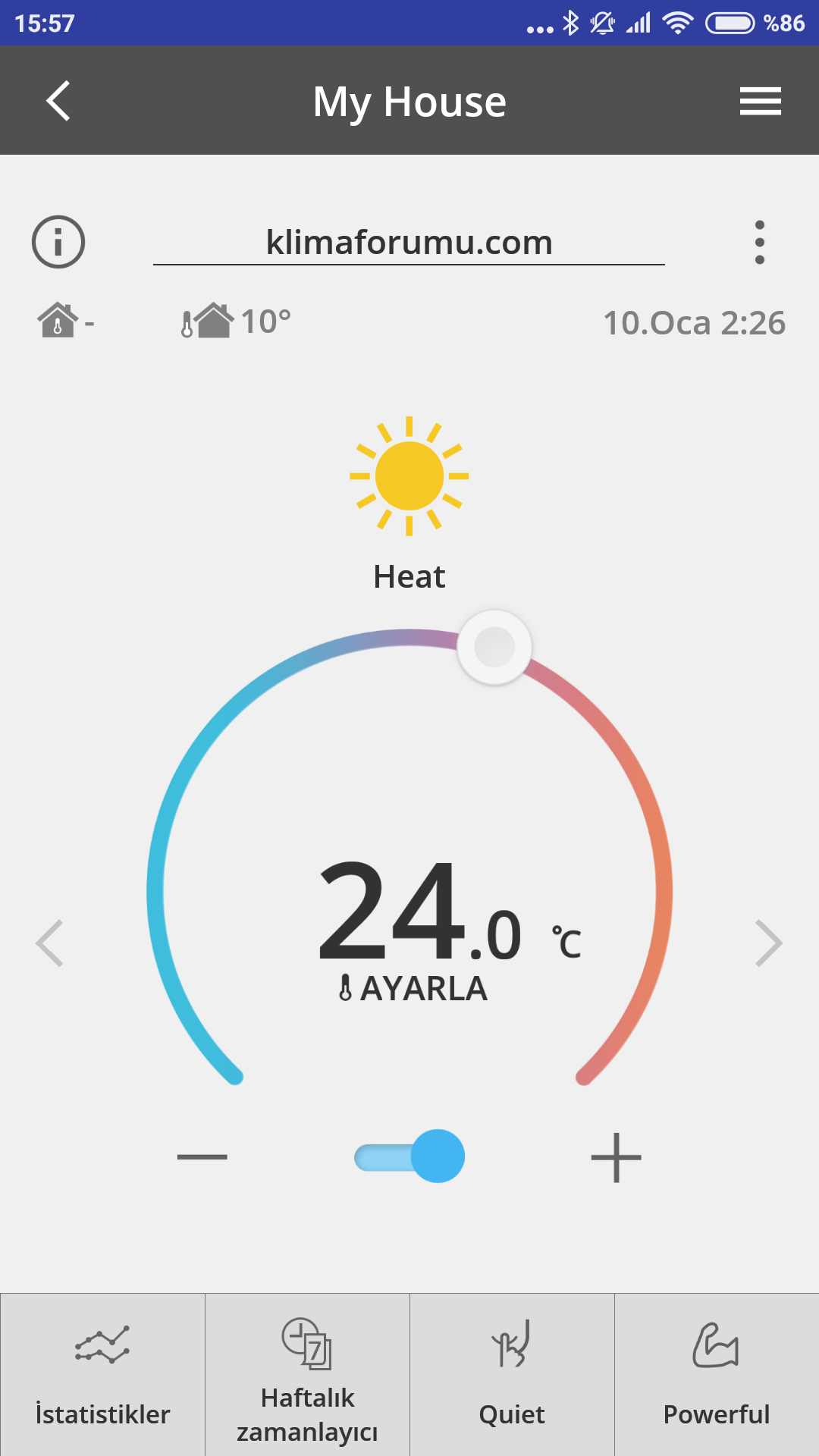 Задайте температура 24, висока скорост на вентилатора. температура на външния въздух 10 градуса,