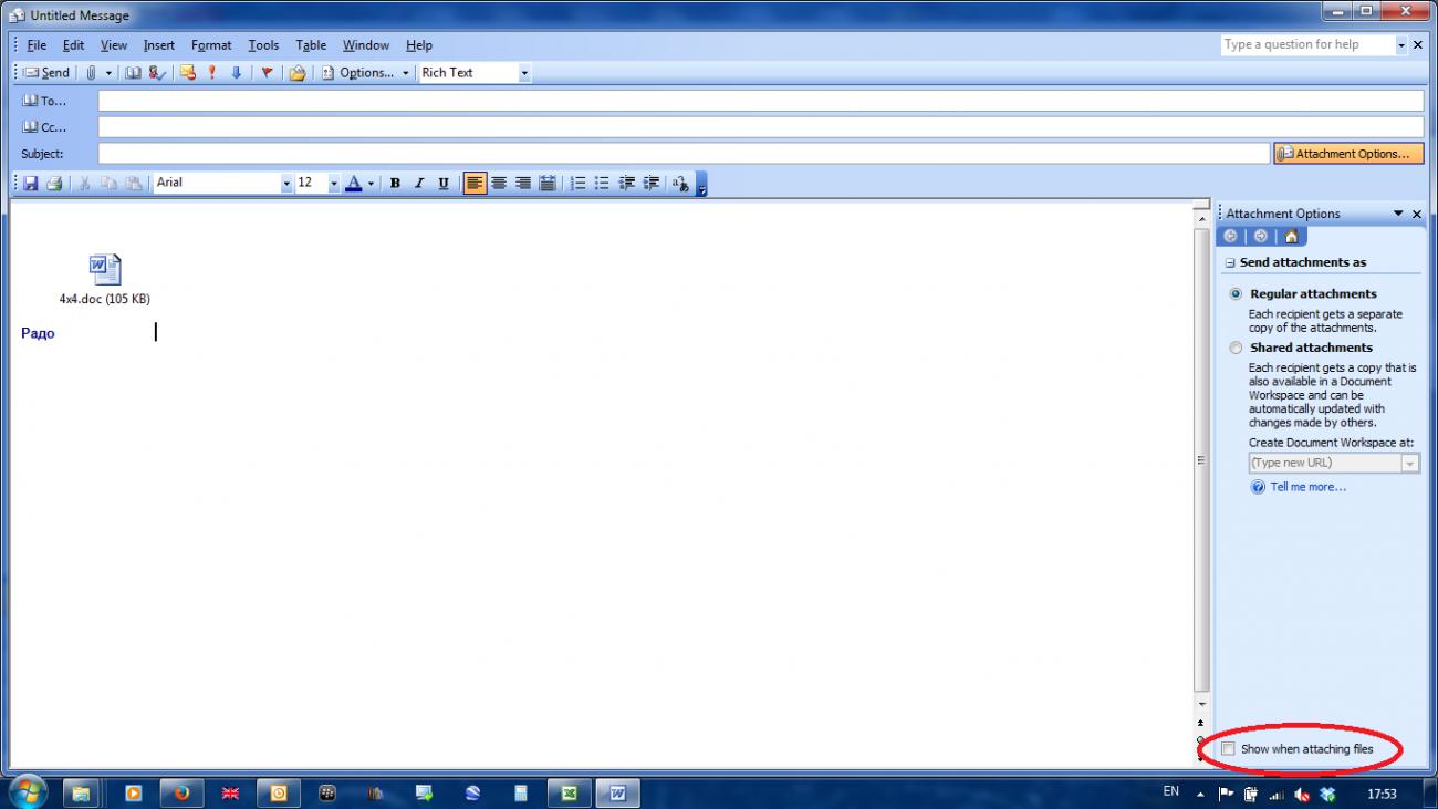 Като си на Atach - в дясно имаш Atachment options - там си избрал отметката "Show when atachin file"