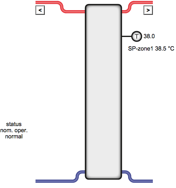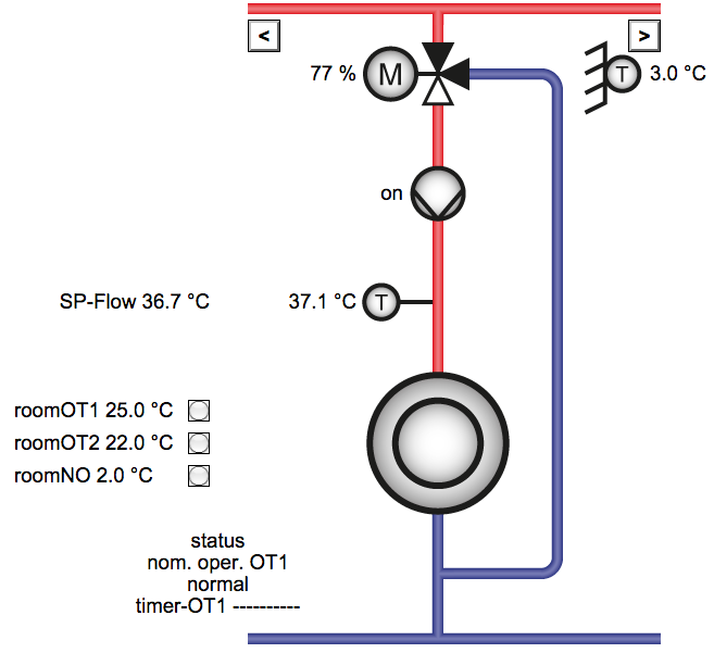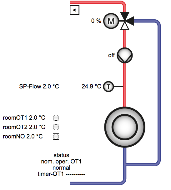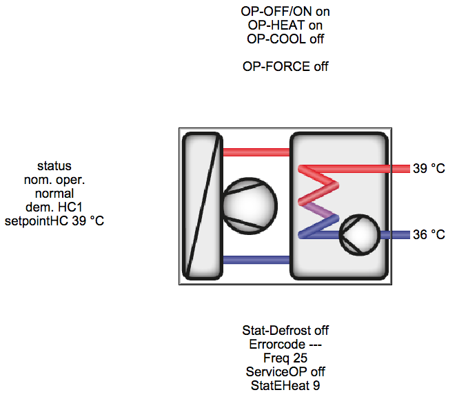 Контролер 1 следи температурата във водосъдържателя за БГВ, буферния съд на басейна, подовото в котлована, температурата в помещението, температурата в тавана и чрез термопомпа 1 външната температура. Картинката изглежда така:
