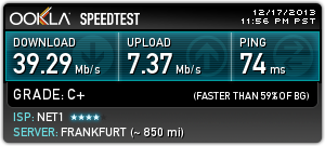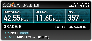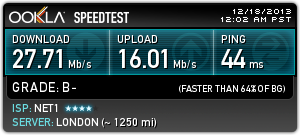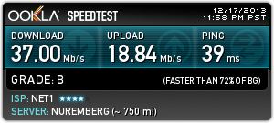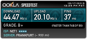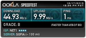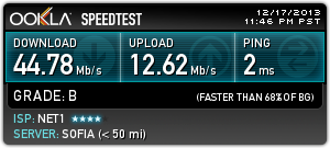 Нет 1, 45 Мbps, свързване директно на LAN кабел в мрежова карта (без рутер, суитч и т.н.). Резултати към 22:30. За София тестовете са към Комнет и Макстелеком (странно не се появява в поста...).