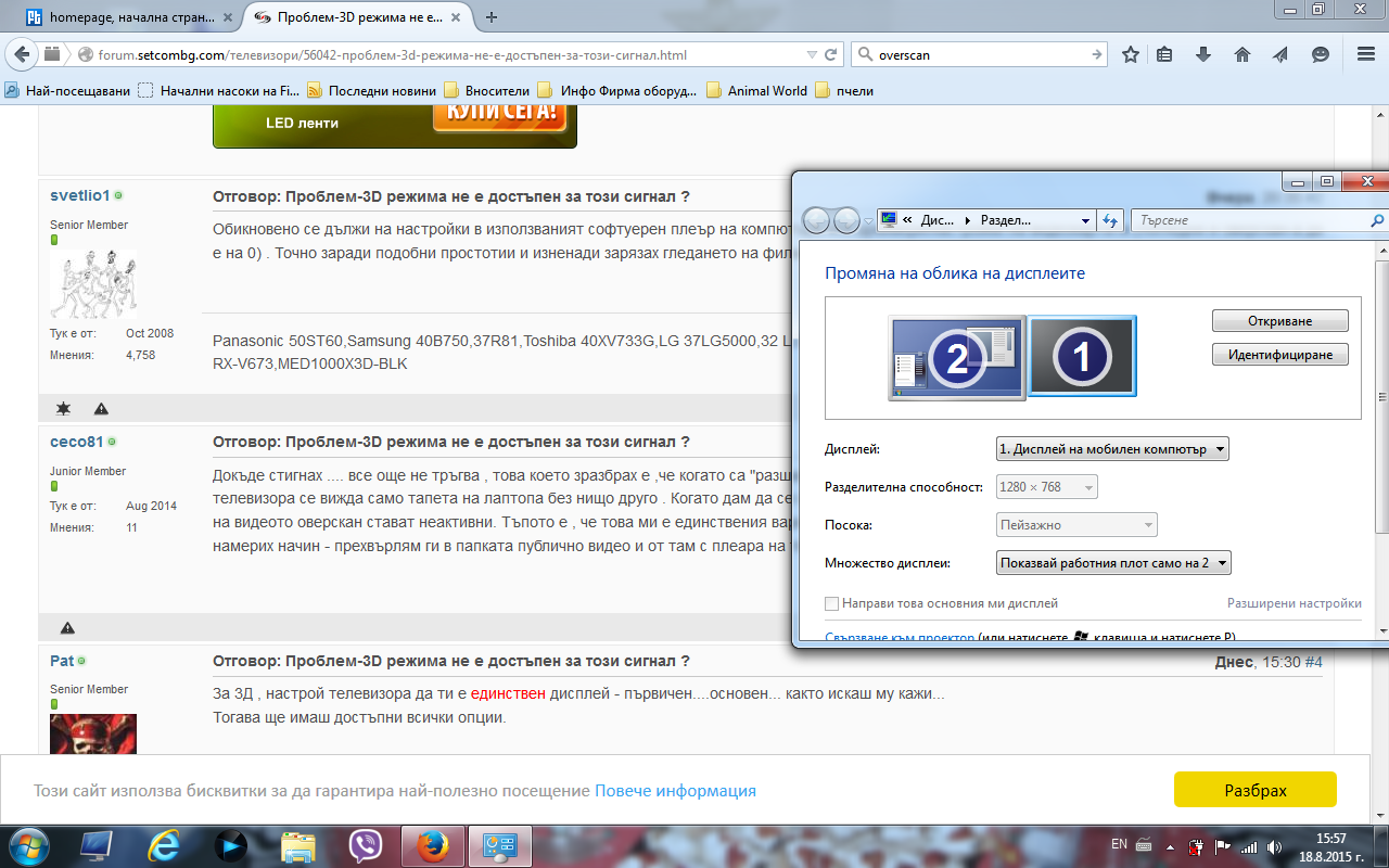Докъде стигнах .... все още не тръгва , това което зразбрах е ,че когато са "разширени" дисплеите ми разрешава да натисна 3д опцията но тогава на телевизора се вижда само тапета на лаптопа без нищо друго . Когато дам да се клонират дисплеите пак не ми дава да натискам 3д а и във функциите на видеото оверскан стават неактивни. Тъпото е , че това ми е единствения вариант за пускане на 3д със субтитри , иначе за тези които имат бг. намерих начин - прехвърлям ги в папката публично видео и от там с плеара на тв . Продължавам с ровенето по настройките....