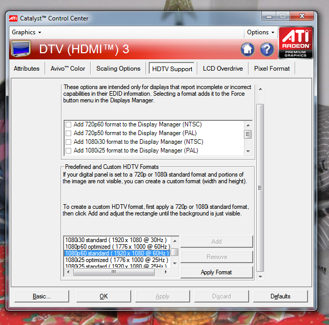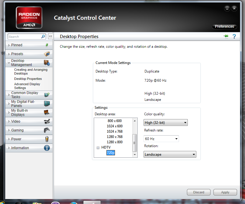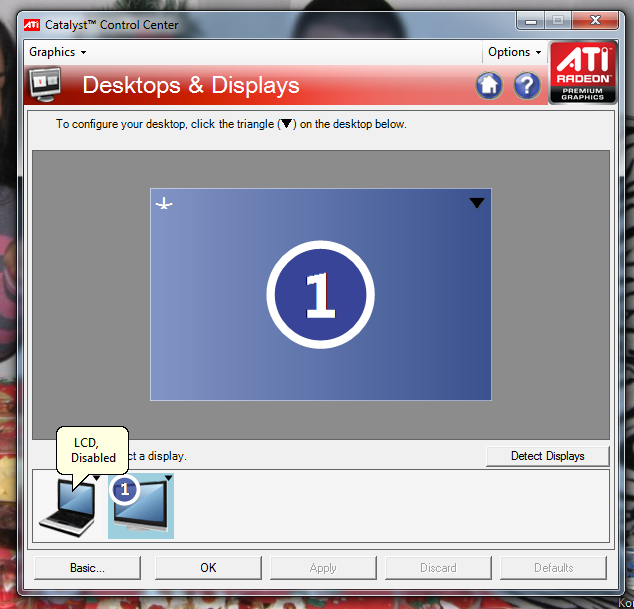 При мен, като съм свързвал лаптопа към телевизора за резолюция на ТВ съм задал 1080p, а на лаптопа си е неговата 1366x768, просто като включа HDMI кабела и превключа на съответния HDMI вход автоматично изключва монитора и включва 1080p на екрана на телевизора. И аз съм ATI Catalyst...