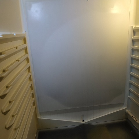 След като го измих хубаво, забелязах, че на задната стена има огромна издутина, все едно някой отзад го е ритнал силно и задната стена е хлътнала навътре. Като го натисна, поддава около 1 см, все едно натискам твърд дунапрен, и после се връща обратно на място. Не знам как е захваната отвътре в стената тръбата, по която минава фреона, за тази пластмаса, но като че ли там в тази издутина изобщо не контактува и охлаждащата площ е драстично намалена. На практика само горе вляво, където се вижда отражението на бялата светлина - там стената е права, не поддава при натиск, контактува си добре с тръбите отзад и затова изстива значително повече. С по-малка охлаждаща площ вероятно по-трудно достига температура и затова компресорът работи повече, съответно горе вляво се трупа скреж и заледява, защото там е най-студено. Натрупването на скреж е точно така по извивката както се вижда. Само предполагам за тези неща, но дали е така...
