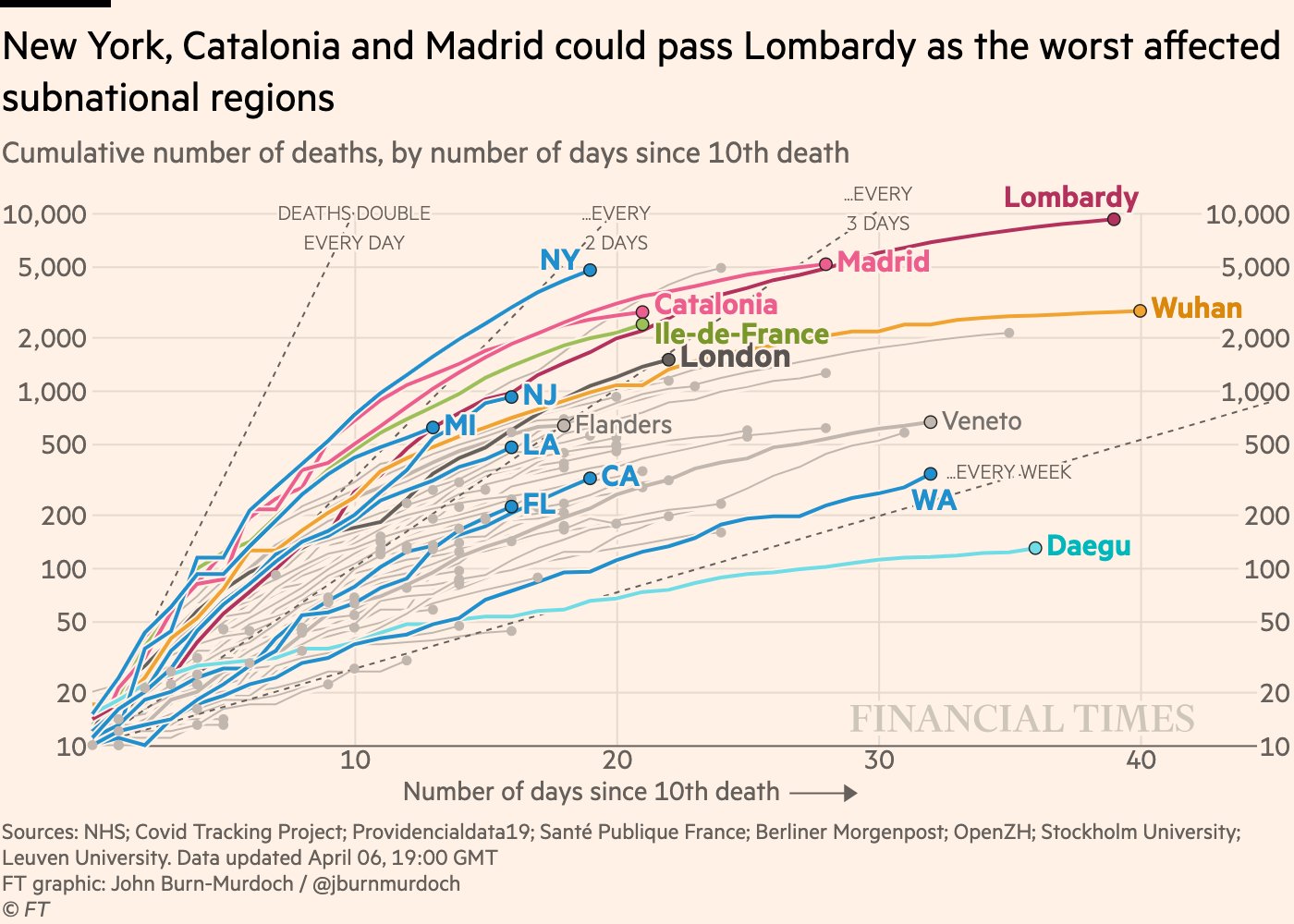 • NY на много по-стръмна крива от Ломбардия на същия етап; почти сигурно ще завърши с най-високо потвърдената смъртност на международните субнационални региони