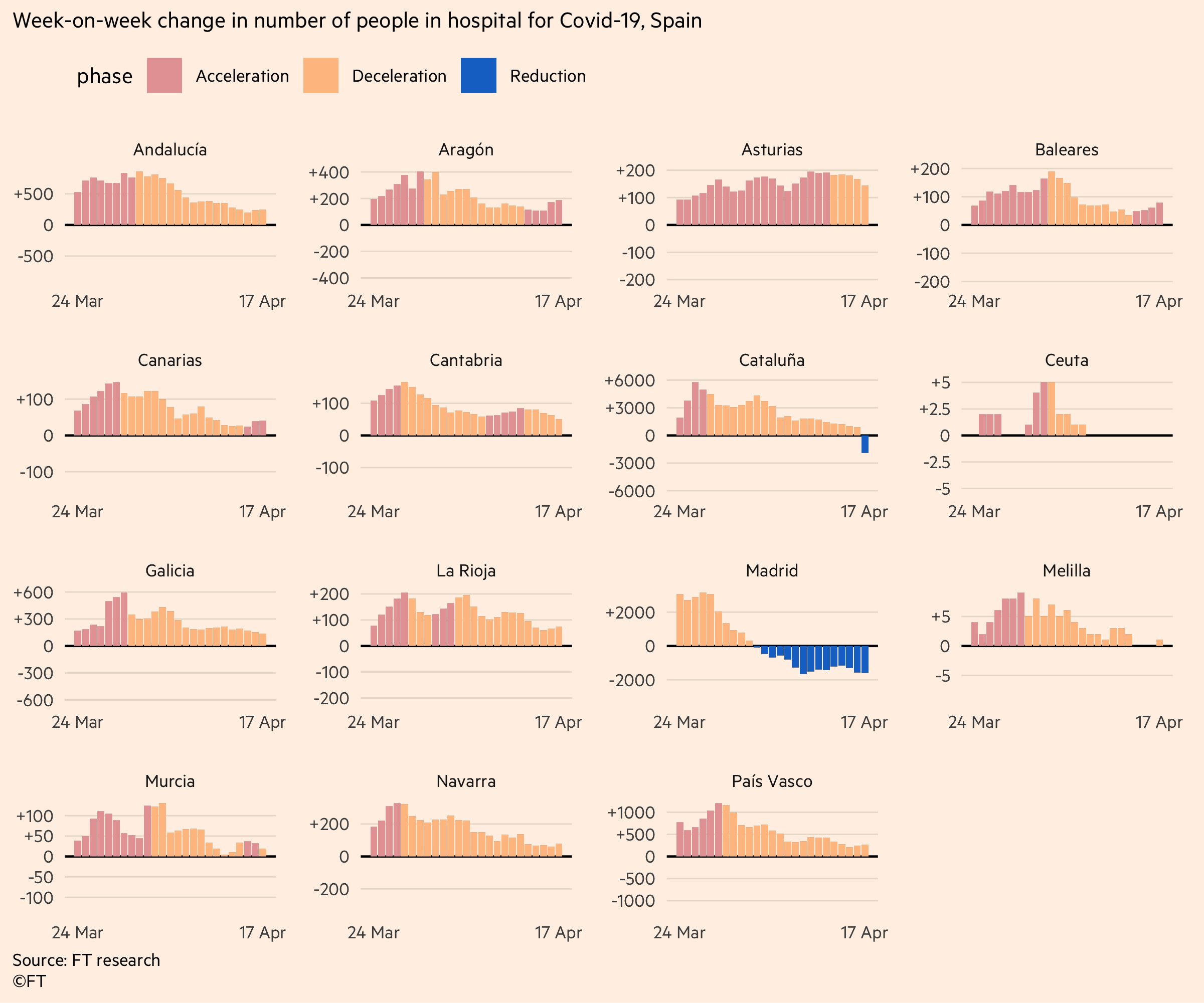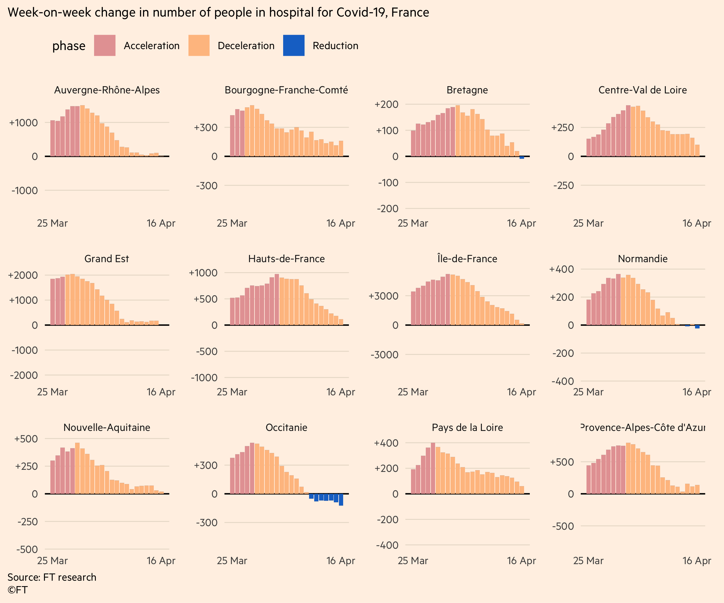 • Но в повечето други региони, въпреки че темпът на нарастване се забавя, всеки ден все още носи повече хоспитализации, отколкото изписвания