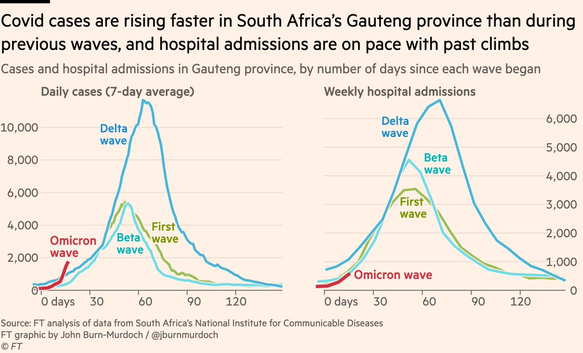 НОВО: знаем случаите, които се увеличават бързо в Южна Африка, но какво да кажем за тежките резултати? Прекарах вчерашният ден, събирайки заедно хоспитализации за провинция Гаутенг, за да можем да сравним зараждащата се вълна Omicron с тези, които я предхождаха. Досега приеманията следват ~същия път като миналите вълни.
