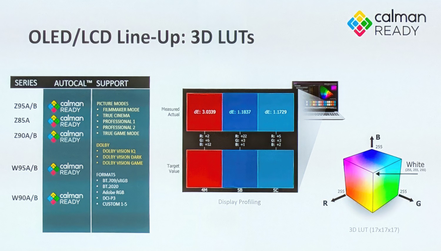 Калибрирането може да се извърши и с 3D LUT таблици с размери 17 x 17 x 17 точки . Налични са девет банки памет: пет напълно персонализируеми, плюс специални за Rec.2020, Rec.709, Adobe RGB и DCI-P3. Резултатите могат да се приложат към други видео режими, специфични входове и приложения, включително медийни плейъри. За професионалистите има опция за заключване на настройките и предотвратяване на случайни промени.