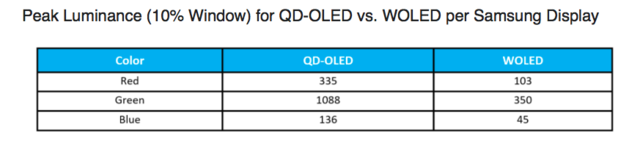 200 нита са обещани за QD-OLED панел на цял екран, 1000 за 10% прозорец и 1500 за 3% прозорец. И най-вероятно тези резултати са получени на некалибриран телевизор и в неизвестен режим (може би в Dynamic), а не в съответствие с индустриалния стандарт бяла точка D65 (която е по-синя при Samsung). Малко вероятно е тези числа да са значително по-ярки от WRGB телевизора за 2022 г. Като се има предвид, че дори миналогодишният Sony A90J срещу Panasonic JZ2000 успя да достигне 1300 нита в Bright режим, макар и не повече от 10 секунди.