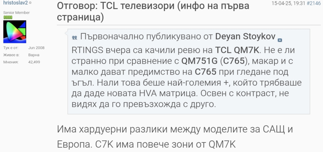 Можеш да видиш, кога сме го коментирали, въпросното ревю на RTINGS. И пак в същото ревю пише следното: "TCL QM7/QM751G QLED и TCL QM7K са подобни телевизори, въпреки че по-новият QM7K предоставя малко по-добро качество на изображението поради значително подобреното си контрастно съотношение".